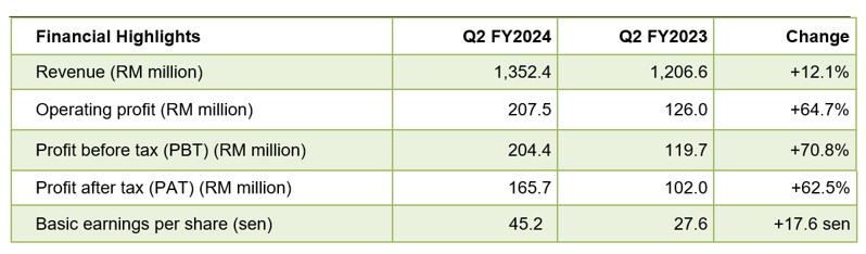 The Group profit after tax increased by 62.5% to RM165.7 million (Q2 FY2023: RM102.0 million) from higher profits, although moderated by higher interest costs and tax expense.