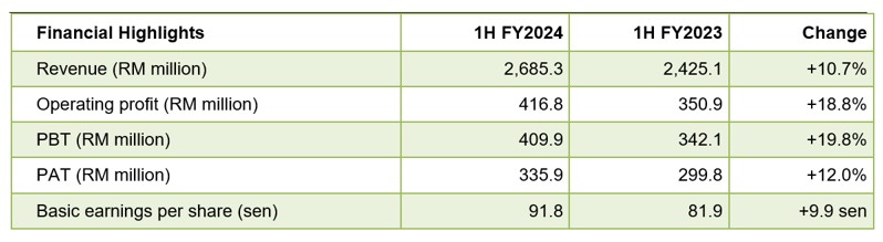 The Group profit after tax increased by 62.5% to RM165.7 million (Q2 FY2023: RM102.0 million) from higher profits, although moderated by higher interest costs and tax expense.
